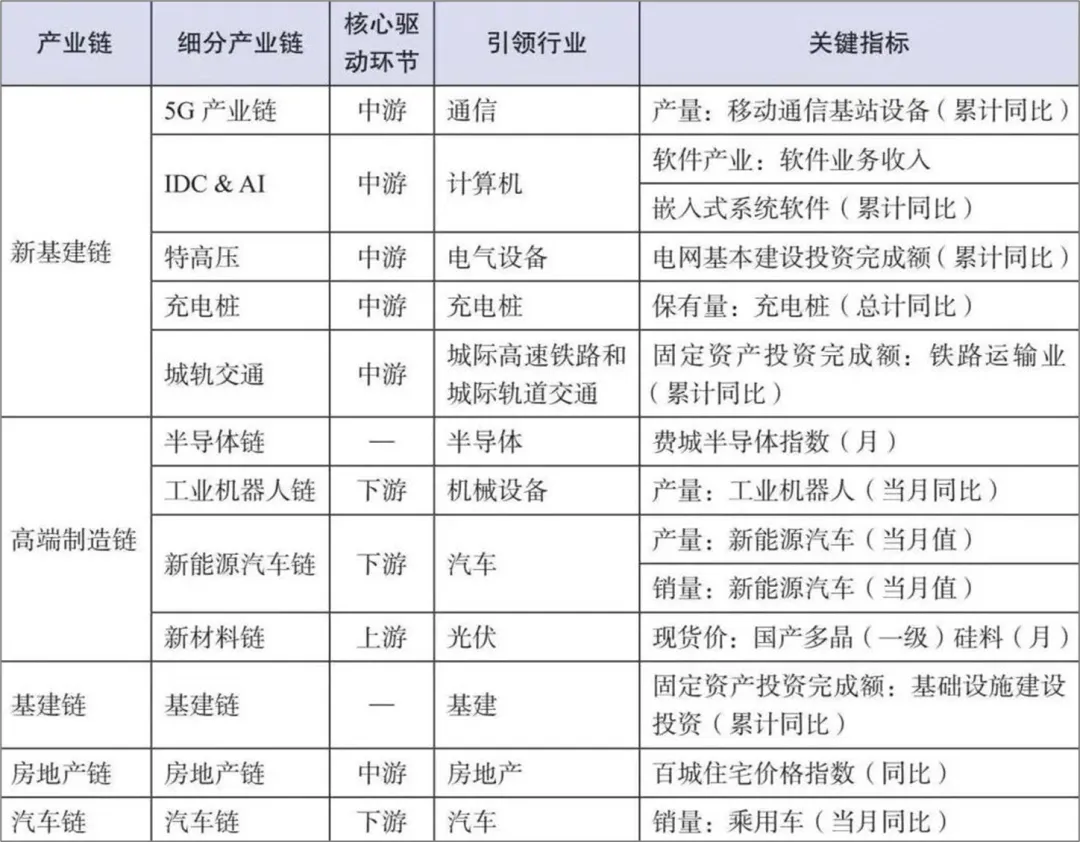 要搞清楚产业链中的核心行业是什么,可以查看券商的行业研究报告,也可以网络查询。下图是常见产业链核心驱动环节和景气度指标:
