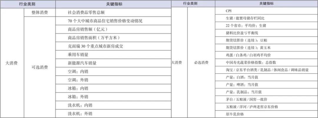 必选消费,主要看通胀,一般用CPI(居民消费价格指数)来衡量。可选消费,主要看房地产业的情况。下图是大消费的关键景气度指标: