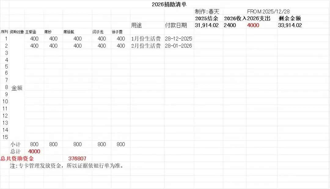 2026年2月份,资助5名学生各400元的生活费,已由孙老师支付给各位学生。
