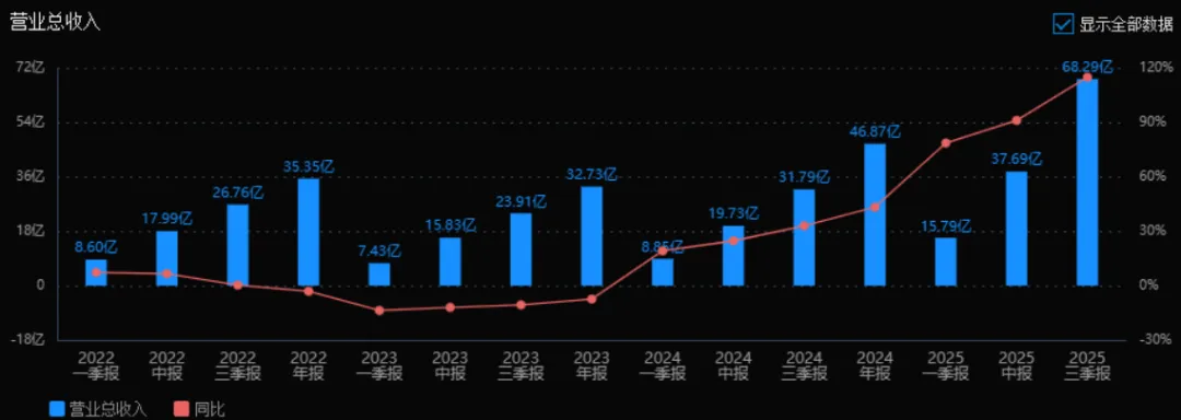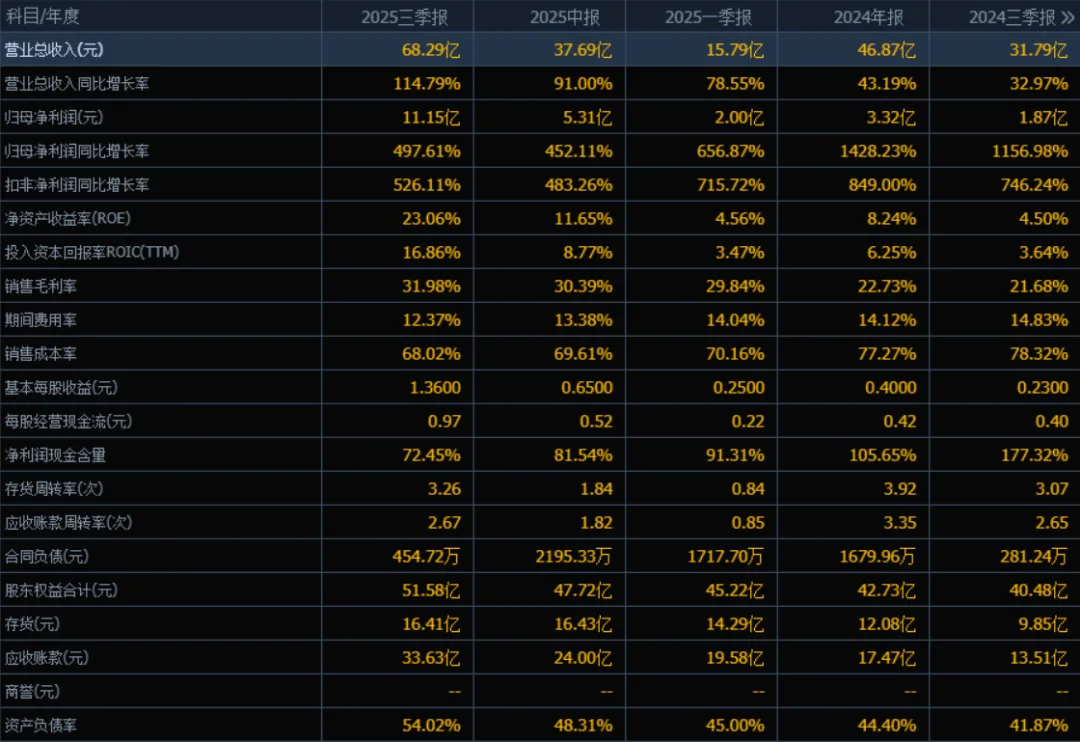 1)营业总收入2025年三季度的营业总收入为68.29亿元,相较于2024年三季度的31.79亿元,同比增长114.79%。评价:收入规模实现翻倍以上增长,说明公司业务扩张迅速,市场表现强劲。