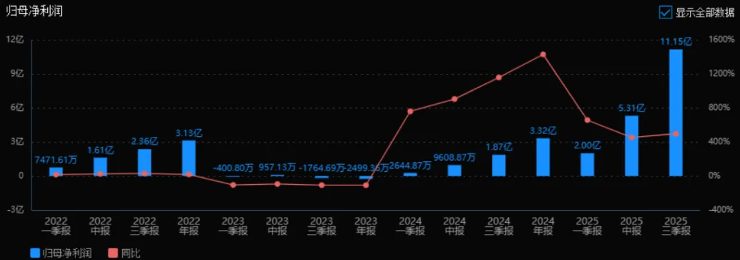 2)归母净利润2025年三季度的归母净利润为11.15亿元,相较于2024年三季度的1.87亿元,同比增长497.61%。评价:净利润增速远高于收入增速,显示盈利能力大幅提升,经营效率显著改善。