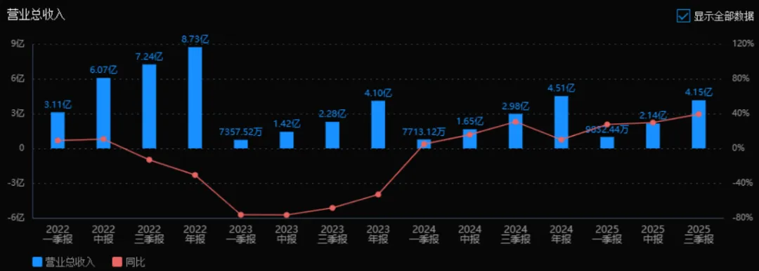 营业总收入:2025年三季度的营业总收入为4.15亿元,相较于2024年三季度的2.98亿元增长39.29%。评价:收入增速显著,呈现加速增长趋势(2025年前三季同比增长率均高于2024年同期),说明业务扩张和市场表现良好。