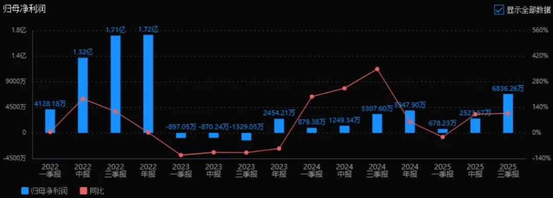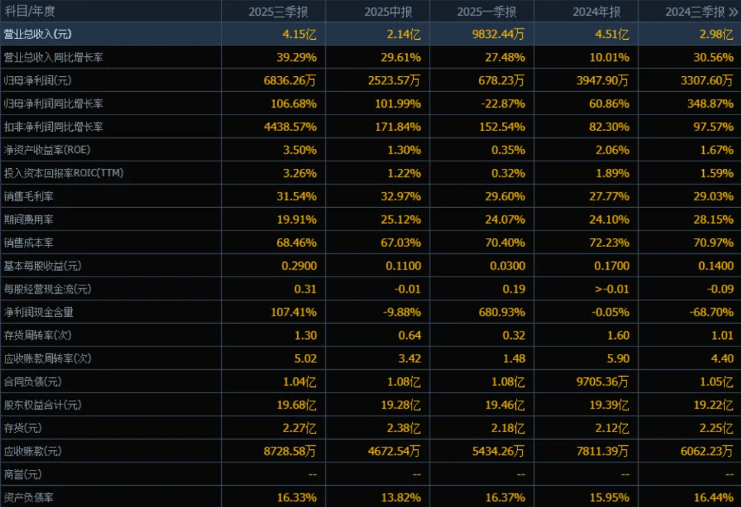 归母净利润:2025年三季度的归母净利润为6836.26万元,相较于2024年三季度的3307.60万元增长106.68%。评价:净利润增速远超营收增速,显示盈利能力的明显改善,成本控制或经营效率提升。