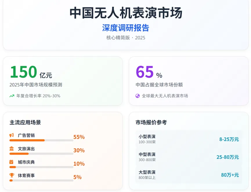 从全球视角来看,中国已成为全球最大的无人机表演市场。2025年全球表演无人机市场规模约为12.8亿美元,其中中国占据65%的份额,达到8.3亿美元。另有数据显示,中国市场占全球市场份额的40%,成为全球最大应用场域。这种领先地位不仅体现在市场规模上,更体现在技术创新和应用场景的丰富度上。