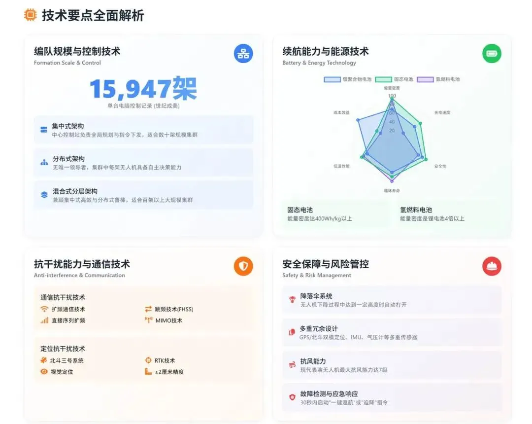 2025年,监管政策进一步收紧和细化。工信部发布的《民用无人驾驶航空器唯一产品识别码》国家标准要求所有民用无人机需植入唯一不可篡改的电子识别码,实现"无码禁飞"。同时,《无人机表演安全技术标准》正式发布,将定位误差阈值从±10厘米收紧至±5厘米,对飞行精度、集群控制和应急响应提出了更高要求。