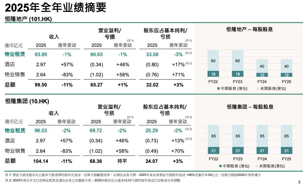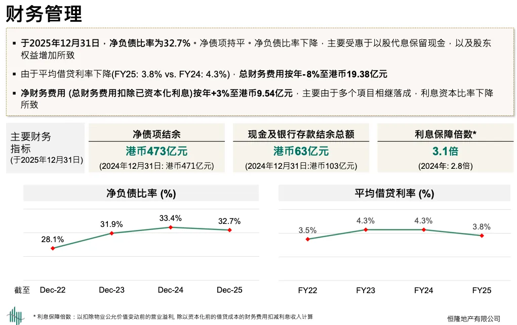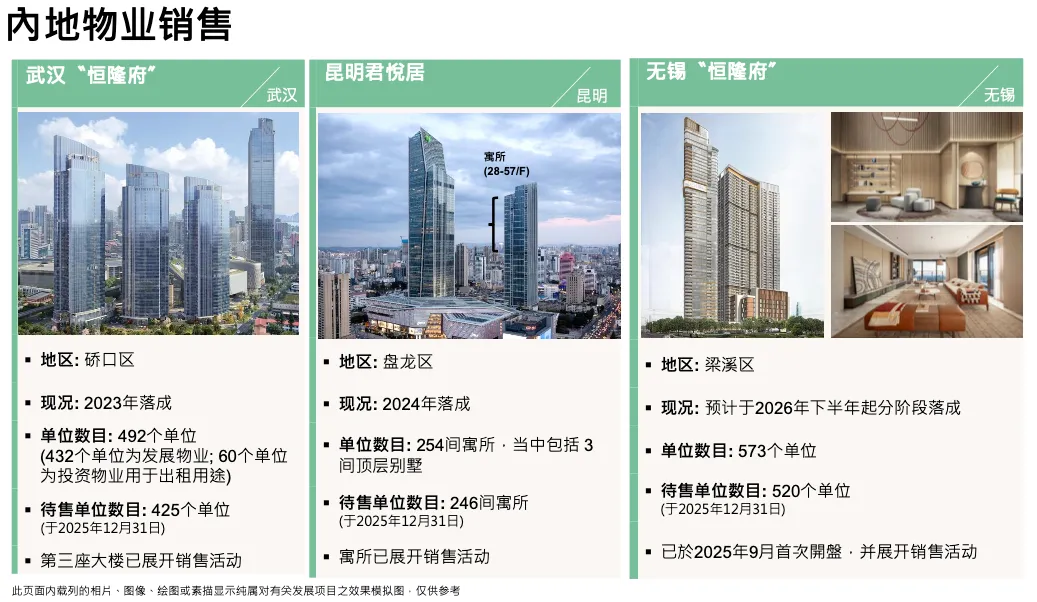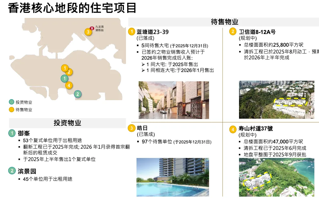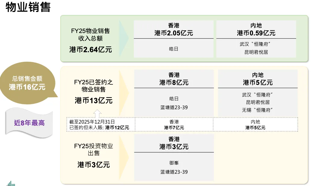 2025 年物业销售回笼 16 亿,是八年来最高,其中 2.64 亿入账 2025 年,其余 2026 年确认。12 亿中 7 亿来自香港,5 亿来自内地,还包括 Summit 和 Blue Pool Road 出售。市场改善后能以正利润出售,有助于降杠杆。