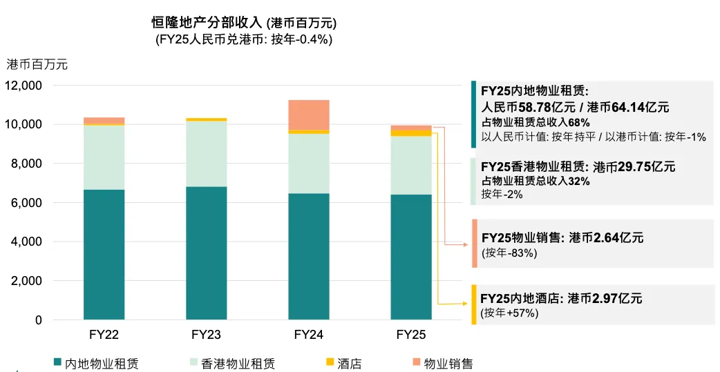 如果看内地收入方面,尤其是租金收入为 58.78 亿元,占我们总租金收入约 68%。按人民币计算同比持平,按港币计算同比下降 1%,正如我刚才提到的,这是人民币贬值的影响。不过看香港,我们把降幅控制在 2%。如果大家记得,上半年下降 4%,现在全年只下降 2%,说明我们在下半年采取了有效措施来缓解全年下滑。部分原因是 Aperture 项目相较 2024 年入账较少。不过我们稍后会讲 2025 年我们做了什么来增加资本回笼。