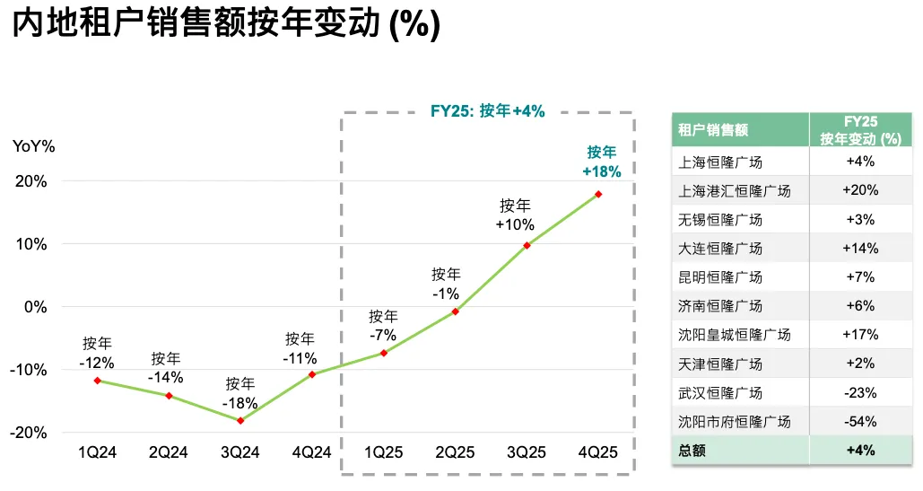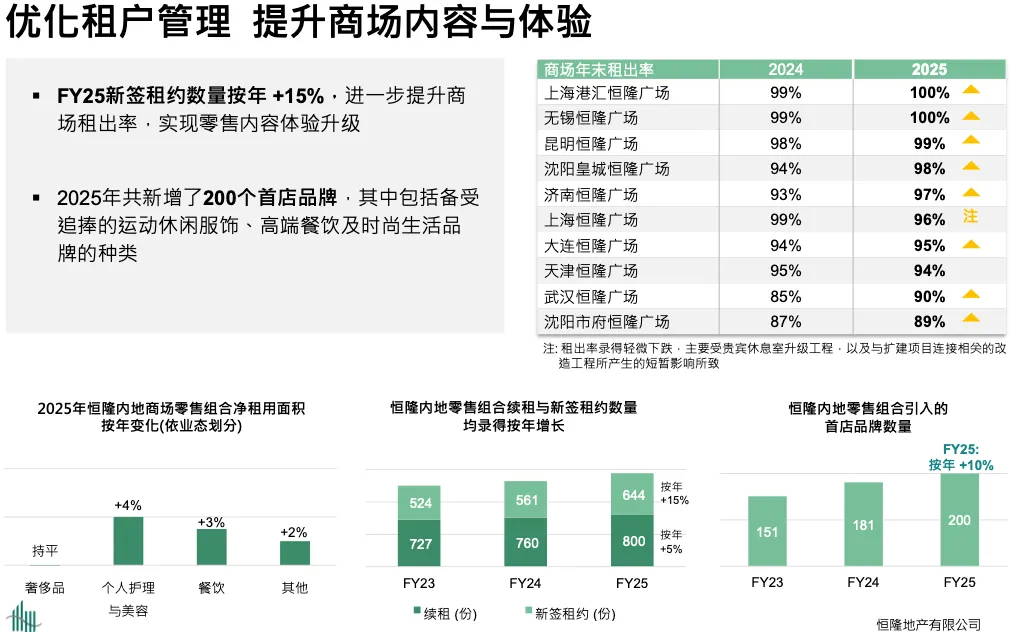 我们做了什么?很多幕后工作来自主动的租户管理。整体来看,大部分物业的出租率提升。Plaza 66 下滑是因为我们在做屋顶及地下通道工程,需要关闭部分商铺,否则出租率应达 96%。整体出租率上升,新租赁面积增加 50%,续租增长 5%。背后做了很多工作,其中 200 个品牌是首次进入所在城市。我们继续引入首进品牌。业态结构也有变化:奢侈品保持稳定,个人护理和美妆面积增长 4%,销售增长 8%。餐饮增长 3%。包括体验业态等销售也同步增长。这些都是销售增长背后的动作,从 2025 年上半年开始见效,下半年成果更明显。