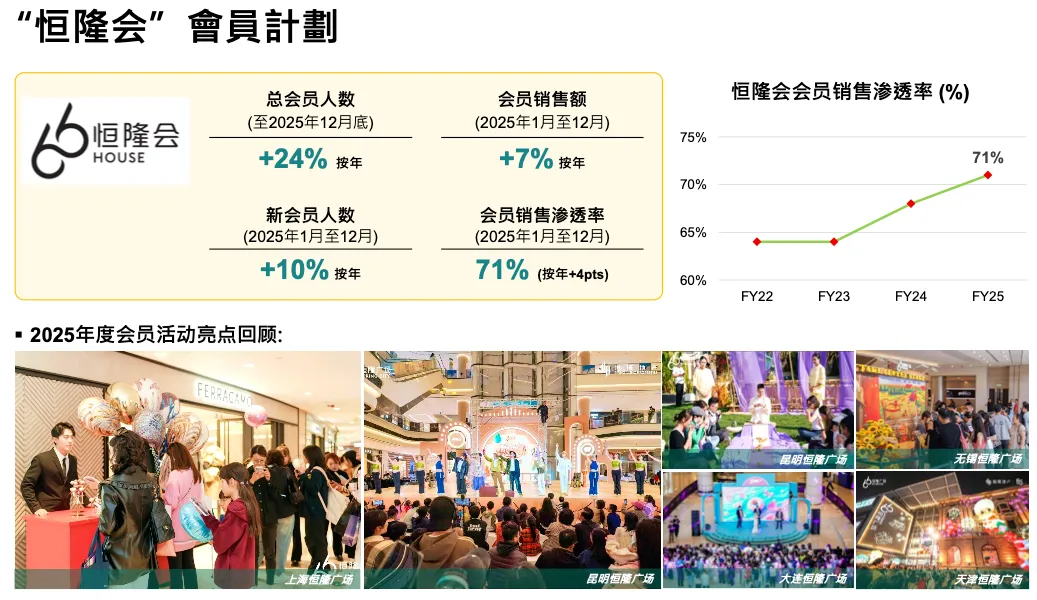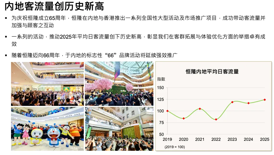 很高兴报告客流量创历史新高,结合 65 周年,我们举办了大量标志性活动、庆祝活动和 IP 活动。过去周末有活动没问题,但工作日客流弱,现在随着餐饮和全价位品牌增加,工作日客流也提升。2025 年奢侈品销售增长强劲,这是多年努力的成果。2026 年将庆祝 66 周年,连续两年纪念并不常见,但 66 对我们有特殊意义。今年将更多面向消费者(去年更多 B2B)。我们相信只要活动有意义、有体验感,顾客就会来。
