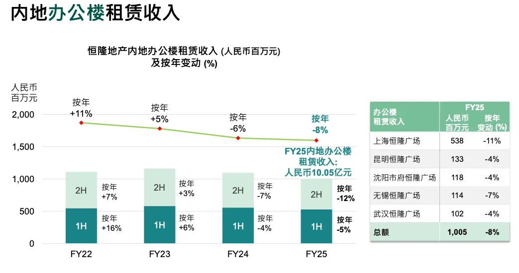 写字楼方面,内地中部市场同比下降,上半年 -5%,下半年扩大到 -12%,部分因为上海一个大租户需要重组租约以长期留住他们。否则合同到期会更糟。当前租户议价能力增强,因为供应多。我们需要谈判让他们留下,可能略高于市场价但能稳定出租率。这种负面影响预计持续 18–24 个月。像昆明、沈阳等城市因优势地位影响较小,但仍需谈判。国内企业业务好时租我们,现在差时想回自有物业,所以拖累仍在。希望外资回流后改善。