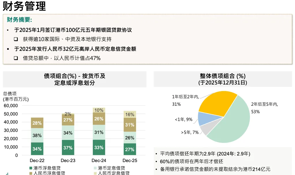 47% 债务为人民币。1 年内到期债务仅 9%,提前一年再融资顺利。去年完成 100 亿港币银团贷款增强流动性。