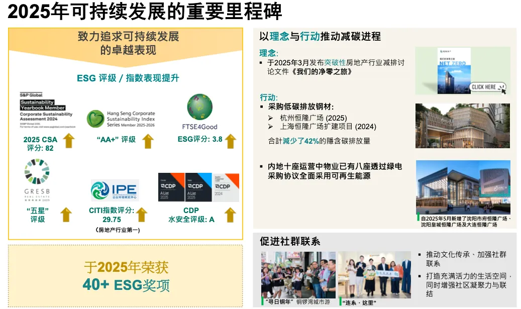 ESG 方面:达成 2025 目标,迈向 2030。发布 2025 年 3 月净零路径文件。Westlake 和 Plaza 66 Pavilion 项目碳排放降 42%。内地 8 个物业使用可再生能源,既减排也降成本。这是战略举措。