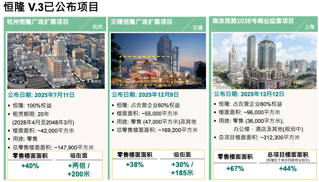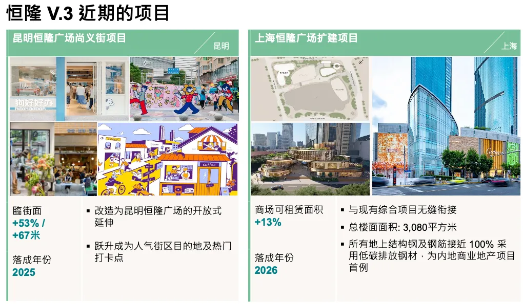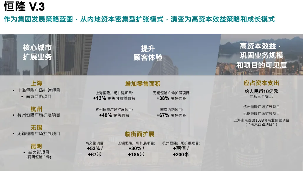 现在把时间交给我,谢谢 Joyce。感谢各位到场以及线上参与的朋友。我们播放 V3 视频的原因,是因为很多人从概念上理解它,但难以想象具体形态,这段视频就是让概念更具象。关于 V3,我今天的核心观点是,它确实为我们翻开了新的一页。这并不意味着我们抛弃旧模式,我们仍然会投资现有物业,仍然认为原有策略有效,但未来的节奏和规模会有所不同。V3 让我们可以在资本开支大幅降低的情况下实现扩张,也就是用更少的资本投入去做我们最擅长的事情。我最喜欢 V3 的一点是速度——从构想到落地快得多。我们的目标是在几年内完成项目。我认为这是可以做到的。相比之下,V2 资产重模式下的一些项目,从买地(第一笔资金支出)到产生第一笔收入,最长要 10 年。即使我们的资本成本很健康,10 年的资本占用仍然太久。我最看重的是新增 GFA、新增规模,这不仅是可租面积,还包括临街面、连通性、社区影响力,以及在城市中的整体存在感——无论是物理层面还是心智占有率。我们聚焦的城市都是表现最强的城市,比如上海、杭州、无锡和昆明。
