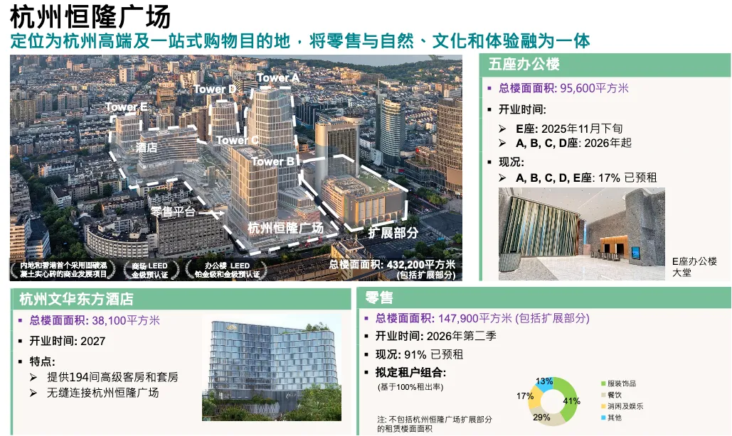 零售方面,上次说预租率 80% 多,目前已达 91%。第二季度开业时开业率 80%,第三季度 90%。项目将成为一站式综合体,涵盖高端奢侈品、餐饮、文化、休闲、地下博物馆及酒店(文华东方),预计 2027 年初开业。