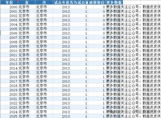 年份 | 省 | 市 | 试点年份 | 是否试点城市 | 政策效应 |