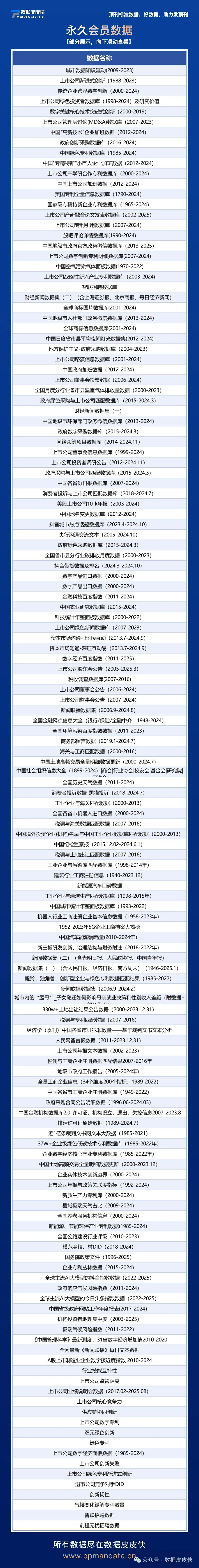 CNPaperData(简称CNPD)是立足大规模数据采集、清洗、挖掘的国家高新技术企业,借鉴Compustat、WRDS等国际知名数据库及FT50期刊专业标准,打造中国特色经济管理社会科学研究型数据库。涵盖上市公司、企业、省份、地级市、县域、高校、人物等研究对象,涵盖经济、法律、金融、政策、科技、文化、健康、环保、人口等各类热门数据。顶刊标准数据,好数据助力发好刊!获取数据地址https://www.ppmandata.cn/trade/list
