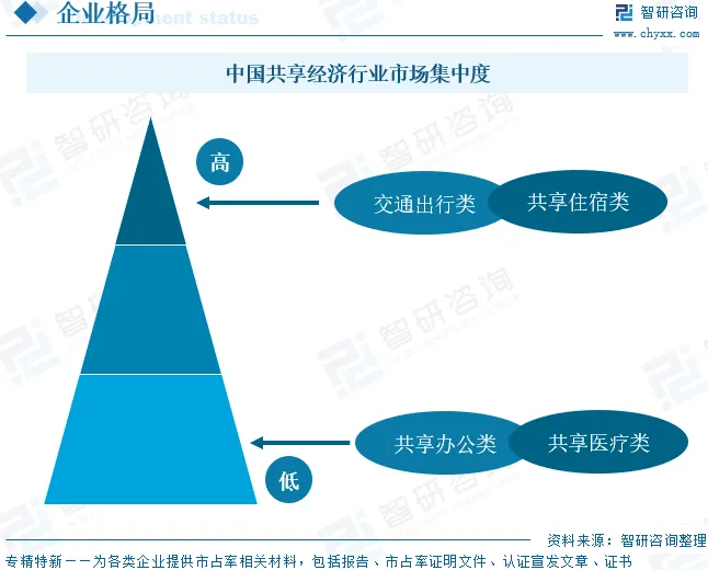 目前,中国共享经济行业中较为成熟的细分领域如交通出行类、共享住宿类板块市场集中度较高,网络效应非常明显,即用户越多,平台的价值越大,因此,大型企业可以利用自身的优势吸引更多用户,从而进一步扩大市场份额,市场被少数几家大企业所控制。然而,相对发展相对滞后的共享办公、共享医疗等市场集中度则较低,其中共享办公的代表性企业有境外企业优客工场、氪空间等。