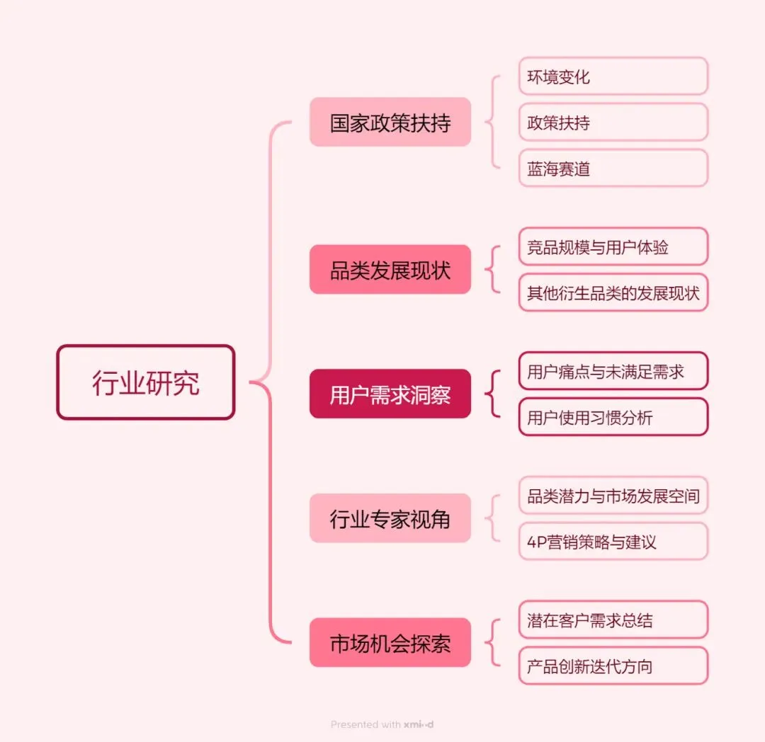 第二,围绕研究的主题,搭建一个细致的逻辑框架,包括你想要研究的每个子主题,比如:国家政策扶持、品类发展现状、用户需求洞察、行业专家视角、市场机会探索等。有了清晰的结构,我们在查找资料的时候就能够有的放矢,先把每个子主题下的重要素材分门别类的放好,然后按照这些素材本身的逻辑结构把他们串联起来,形成一份逻辑严谨、经得起推敲的行研报告。