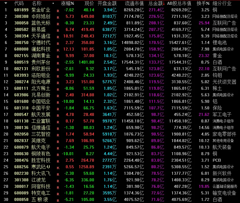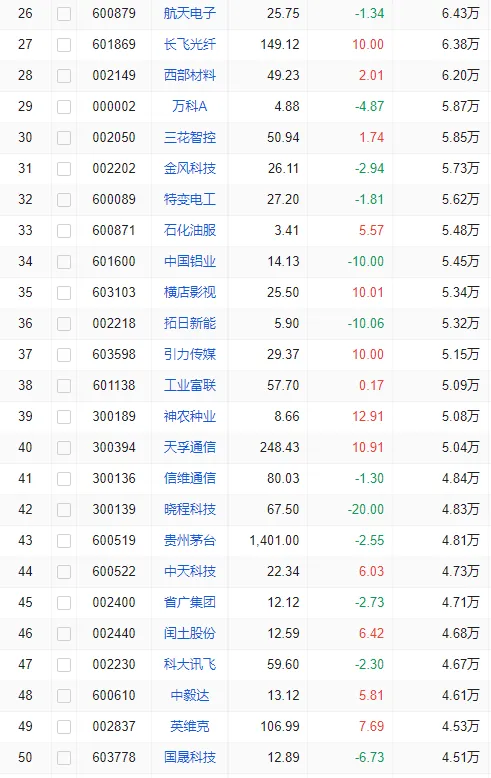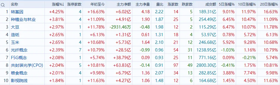 个股方面:涨少跌多,2453只个股上涨,2896只个股下跌。盘面上,市场热点快速轮动,资金从前期强势板块向科技成长及低位防御板块切换。从板块来看,算力硬件、光通信等科技板块逆势爆发,天孚通信涨超10%,长飞光纤、致尚科技等多股涨停,杰普特、环旭电子等个股涨幅居前,形成从光纤材料、光模块到数据中心的完整产业链共振。农业种植概念股走强,登海种业、敦煌种业、农发种业涨停,神农种业、秋乐种业等跟涨。影视院线板块表现活跃,横店影视2连板,幸福蓝海、光线传媒等涨幅较大。下跌方面,贵金属、有色金属板块集体重挫,晓程科技、赤峰黄金、湖南黄金、白银有色等近二十股跌停,成为市场主要的调整力量。油气开采、工业金属等资源类周期股也大幅调整。