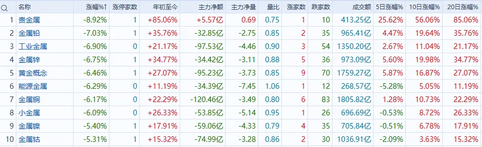 贵金属:板块大幅回调,晓程科技、赤峰黄金等多股跌停,受国际金价单日暴跌近5%拖累。