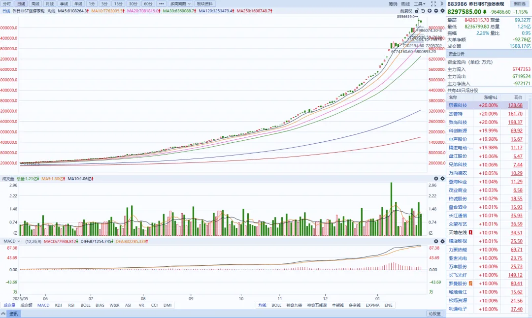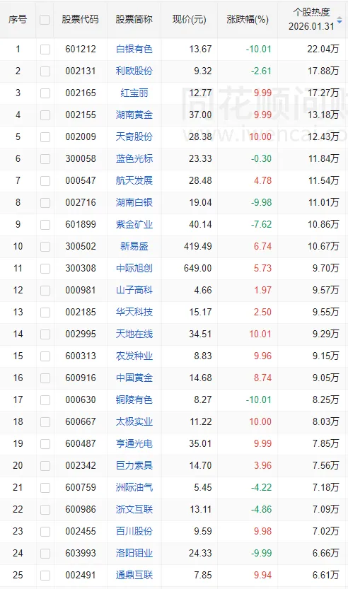 本月热点聚焦度显著提升,有色金属与科技两大主线交替领涨。有色金属板块成为最大亮点,受现货黄金、白银不断刷新历史新高的消息刺激,贵金属方向领涨,权重紫金矿业创历史新高,并且涌现出多只翻倍股,其中湖南白银涨175%,四川黄金涨137%。此外,AI应用概念强势爆发,卓易信息涨98%,蓝色光标股价翻倍。商业航天概念反复活跃,本月上旬持续走强,中国卫通创历史新高,总市值一度突破2000亿。