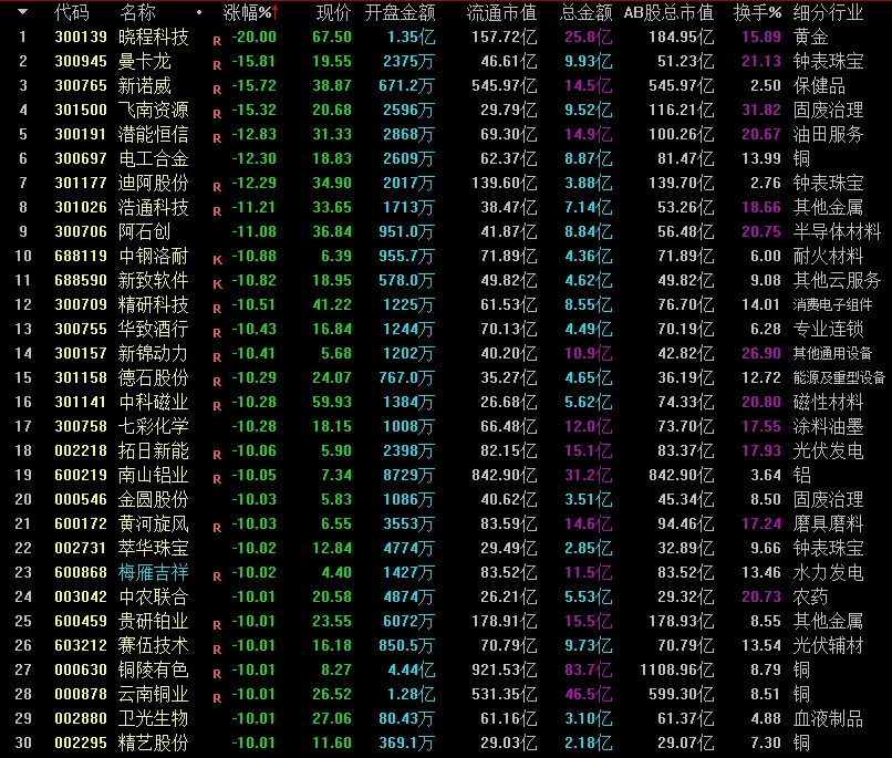 有色金属:锂矿概念股金圆股份跌停,新能源需求预期转弱引发资金出逃。