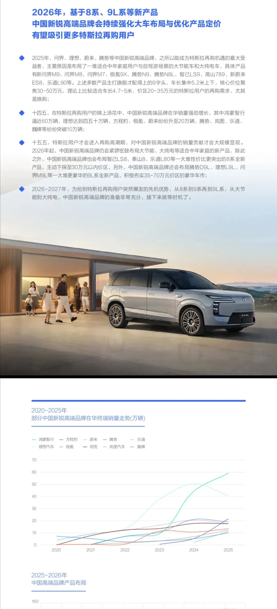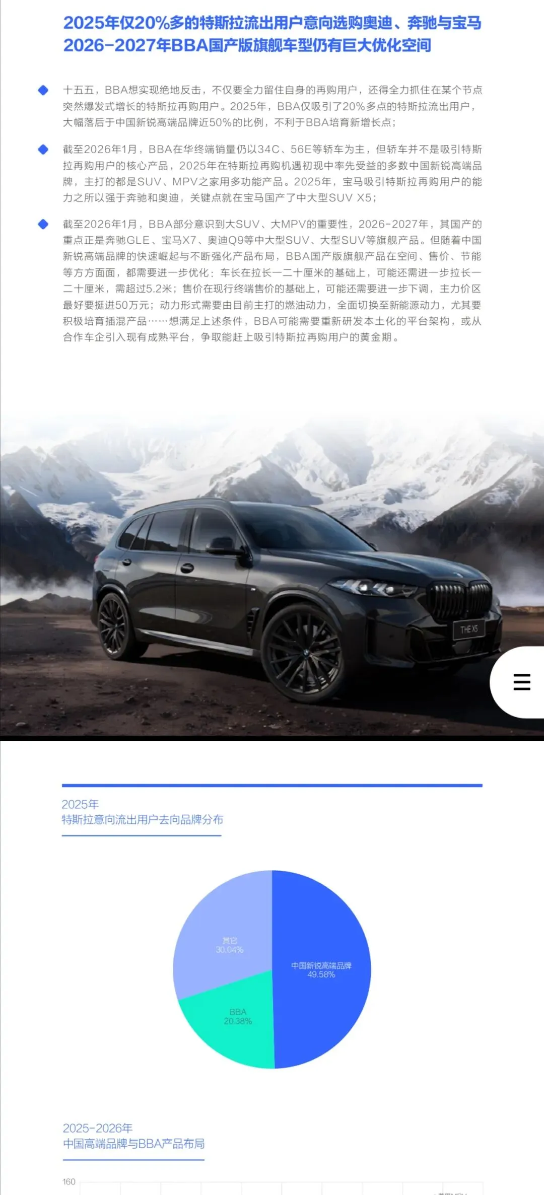 中国新锐高端品牌已率先受益,靠5.2米级大车、增程/插混+大纯电产品矩阵,拿下近半数流出用户;BBA因产品偏轿车、未本土化适配滞后。未来战局关键在产品分层:8系下探30万内走量,9系+9L系夯实高端,大纯电或成新增长点,车企需将战略重心转向抢夺特斯拉再购用户,把握存量竞争黄金期。