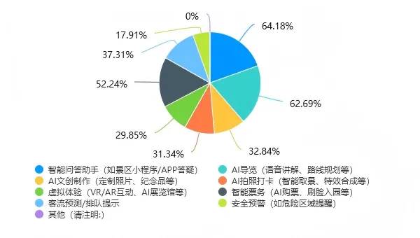 数据显示,58.26%的游客在过往景区游玩中使用过AI相关工具或服务,使用场景呈现多元化特征。其中,智能问答助手使用率最高,AI导览、智能票务、AI 拍照打卡等功能也获得不少游客青睐。