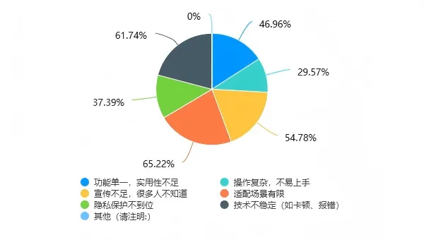 在未来尝试意愿方面,64.35%的游客表示“比较愿意”或“非常愿意”使用旅游AI工具,市场接受度较高。但当前旅游AI工具仍存在明显痛点:适配场景有限、技术不稳定成为硬伤,宣传不足以及隐私保护不到位也被频繁提及。