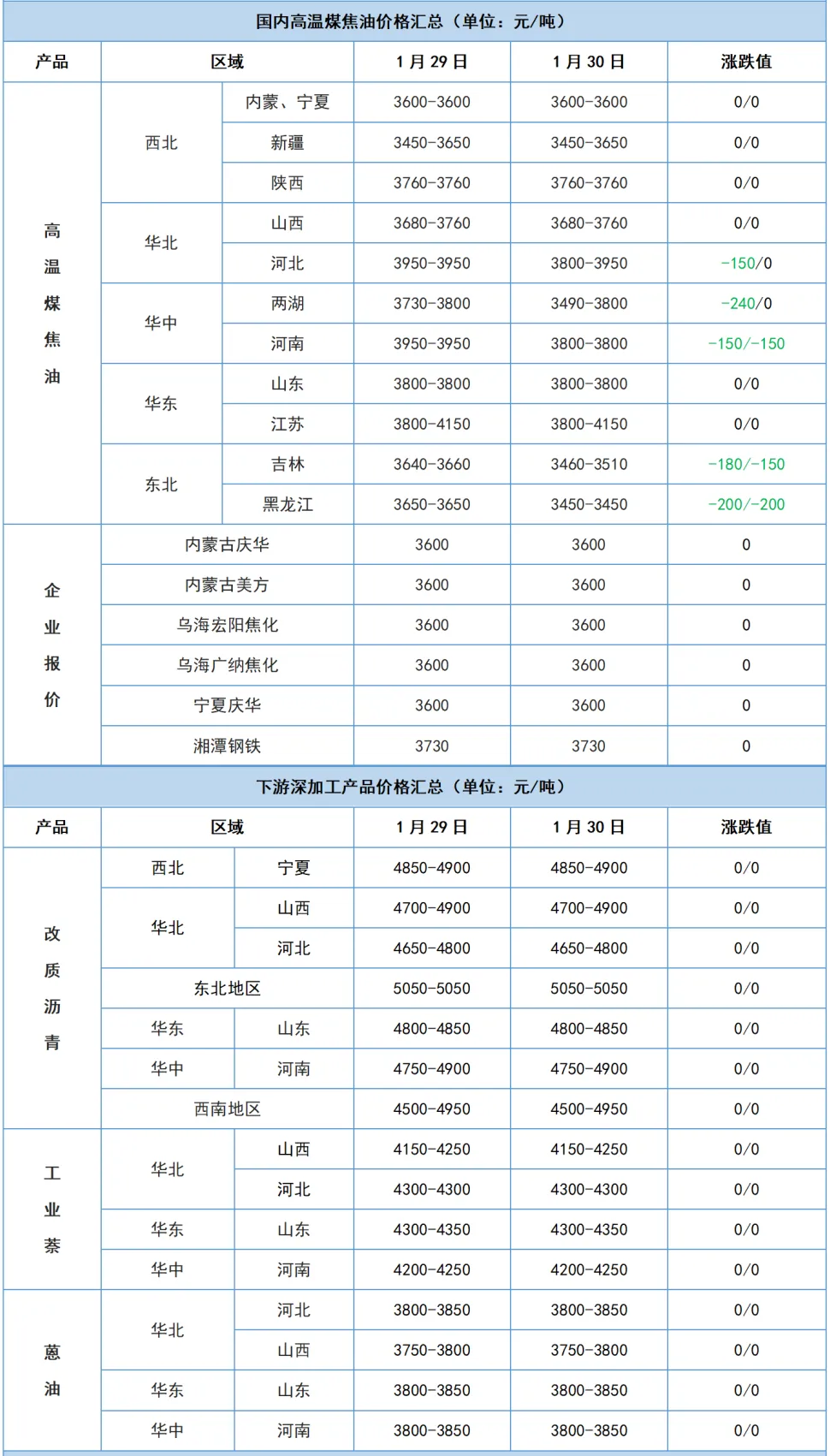 今日国内高温煤焦油市场补跌整理运行,跌幅多在150-240元/吨。供应端方面,焦化厂吨焦平均利润持续亏损,部分焦化开始亏损减产,多数稳定生产,焦企整体开工波动不大,副产物高温煤焦油供应端支撑有限。需求端,下游深加工企业开工尚可,对于煤焦油刚需依旧较强。不过深加工企业成本压力较大,利润空间收窄情况下多打压接货。因此,预计短期高温煤焦油市场偏弱整理运行为主。