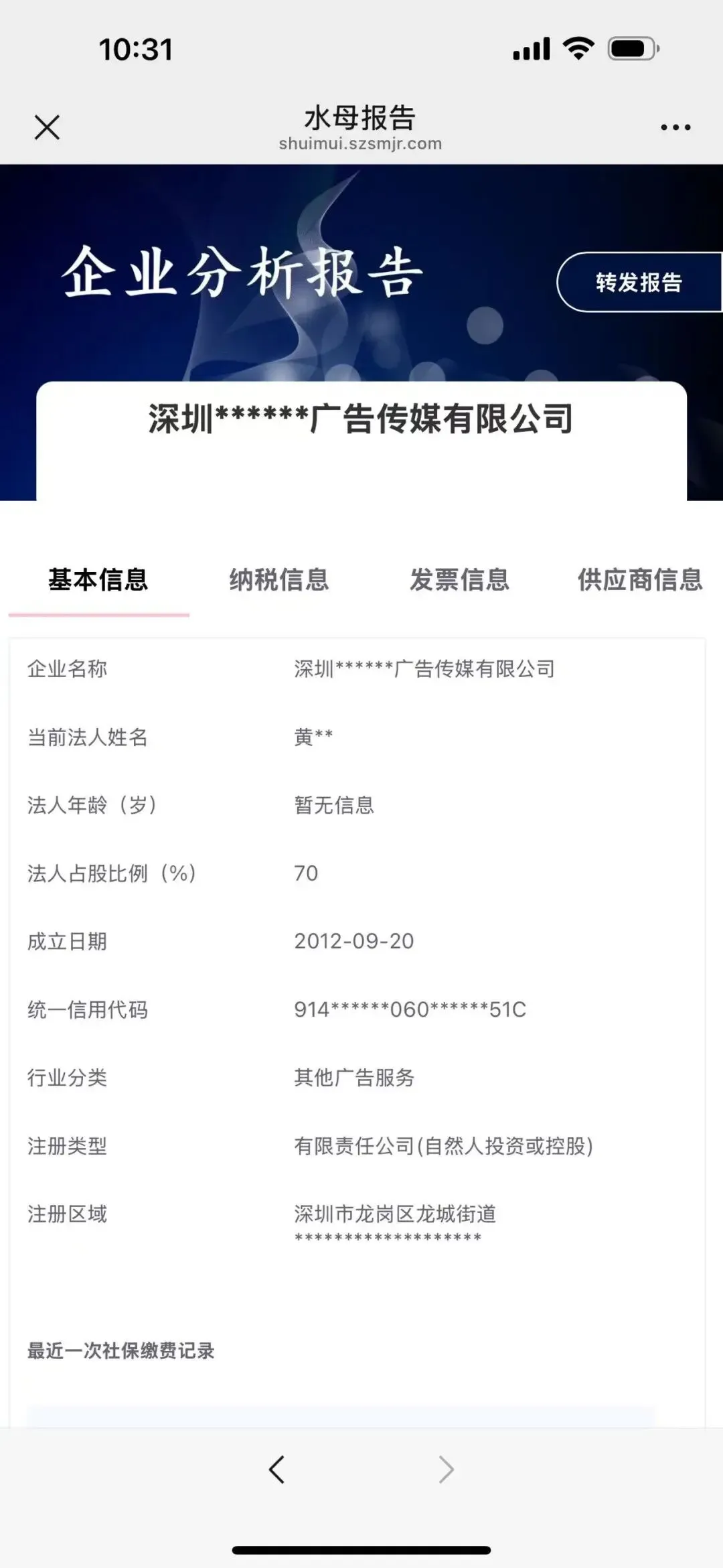 水母报告是一种由第三方机构生成的专业报告,主要用于记录和分析企业近3年的经营数据,主要的应用场景是用于快速判断企业的基本面。①企业基本信息:包括企业名称、成立日期、法人姓名及年龄、法人占股比例、行业分类、统一信用代码、注册类型、注册区域等。②企业纳税信息:涵盖纳税等级、纳税人种类、有无欠税情况、近3年纳税情况等。③企业发票信息:包含近期开票记录、开票增长率、近3年开票金额等。④企业供应商与客户信息:近一年前十供应商信息和前十销售客户信息,用于评估企业供应链稳定性和市场渠道情况。三、水母报告有什么用