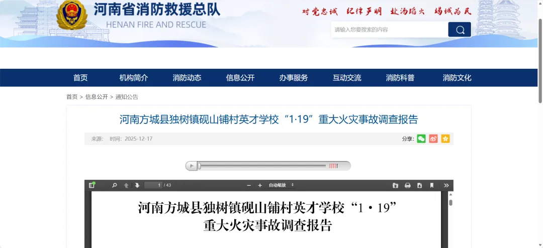 12月17日,河南省发布方城县英才学校重大火灾事故调查报告。经调查认定,该起事故系起火宿舍内一名小学生使用打火机时,引燃宿舍衣服、床铺等物品并迅速蔓延造成的重大火灾。记者从有关部门获悉,河南省纪检监察机关依规依纪依法对履行职责不力、监督管理不到位的25名责任人员作出严肃处理处分。