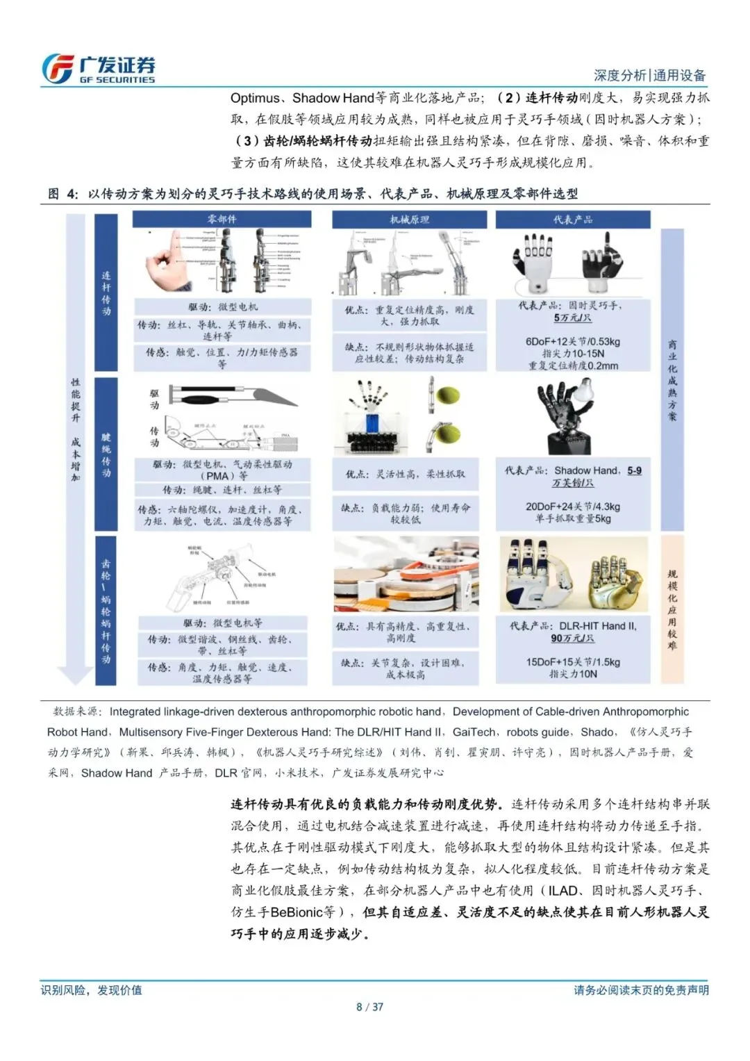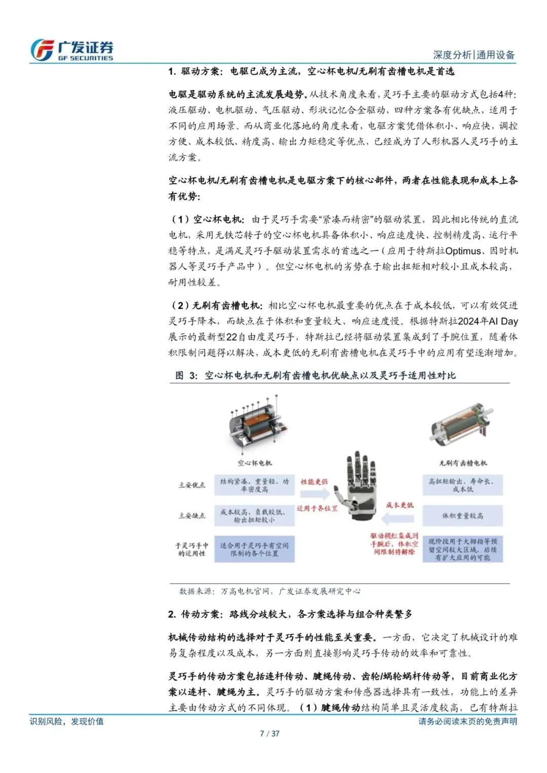 灵巧手的核心组成囊括驱动、传动、感知三大系统。(1)驱动方案:电驱已成为主流,空心杯电机/无刷有齿槽电机是首选。(2)传动方案:主要分为连杆、腱绳、蜗轮蜗杆/齿轮三种路线,其中腱绳传动应用较为广泛。(3)感知方案:内部核心是力传感器、外部核心是触觉传感器,六维力传感器能够实现精准力控,触觉重视电子皮肤的应用。