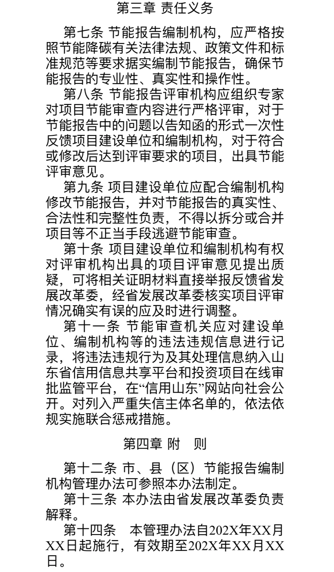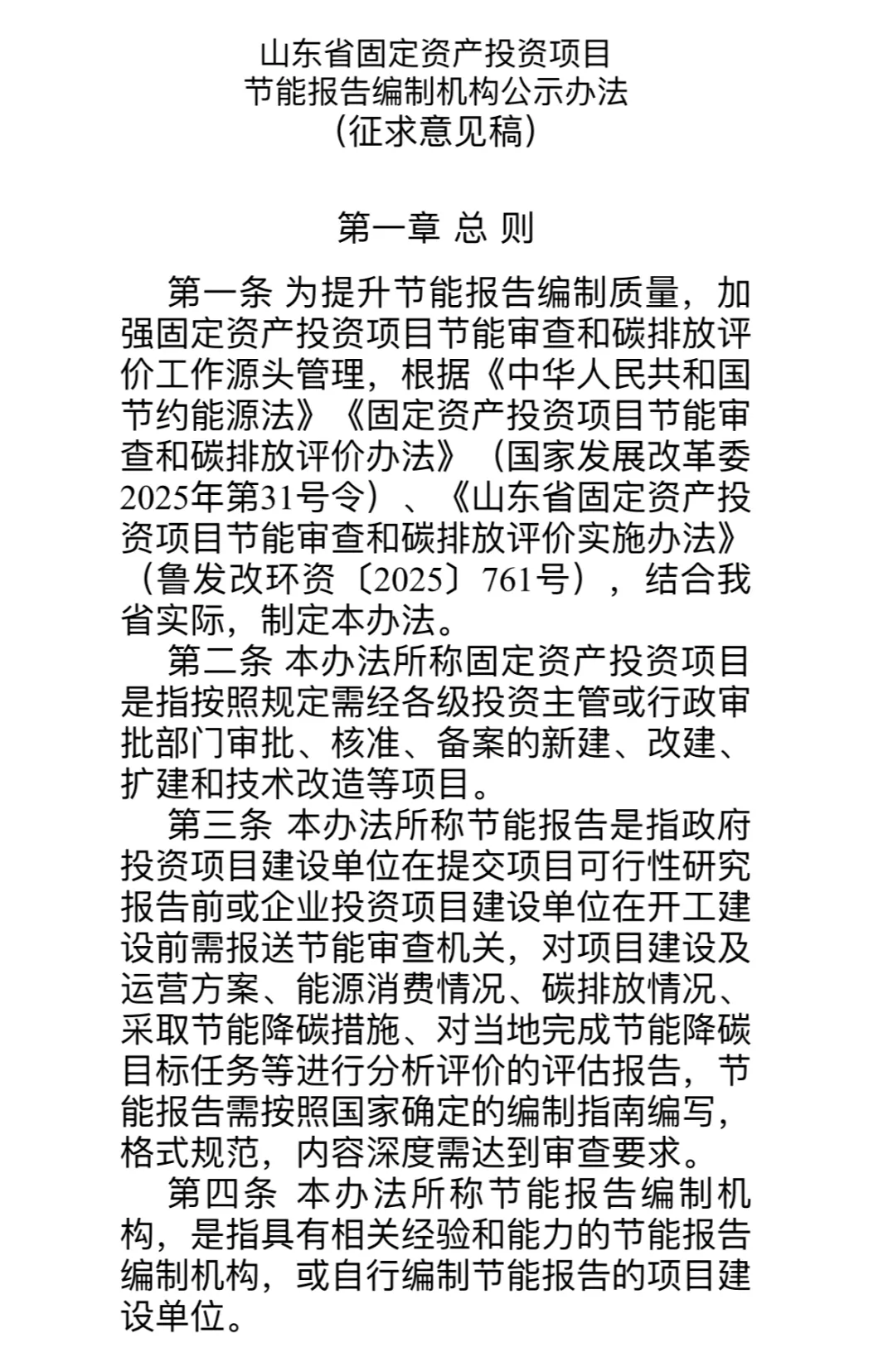 为加强固定资产投资项目节能审查与碳排放评价的源头管理,提升节能报告编制质量,山东省发展改革委日前研究起草了《山东省固定资产投资项目节能报告编制机构公示办法(征求意见稿)》,面向社会公开征求意见。