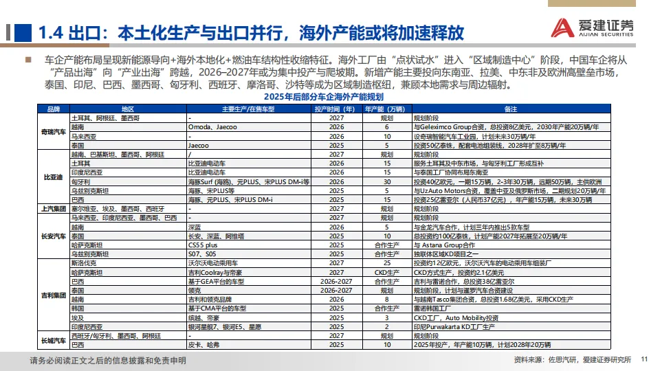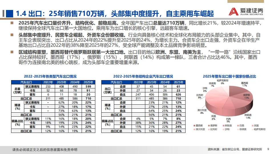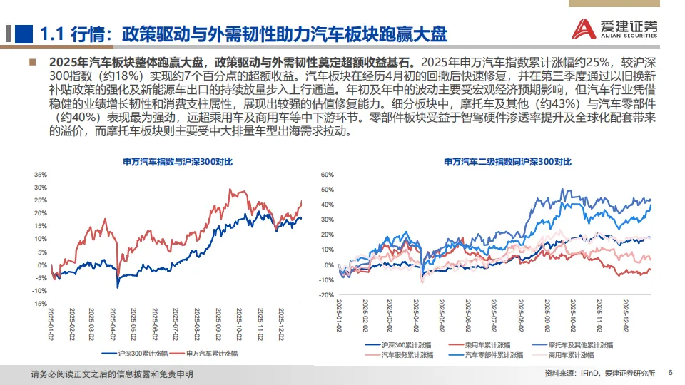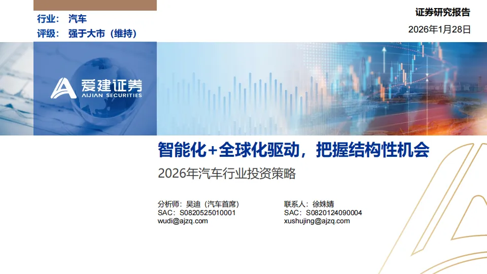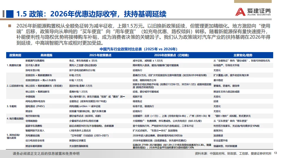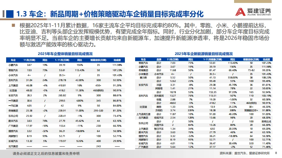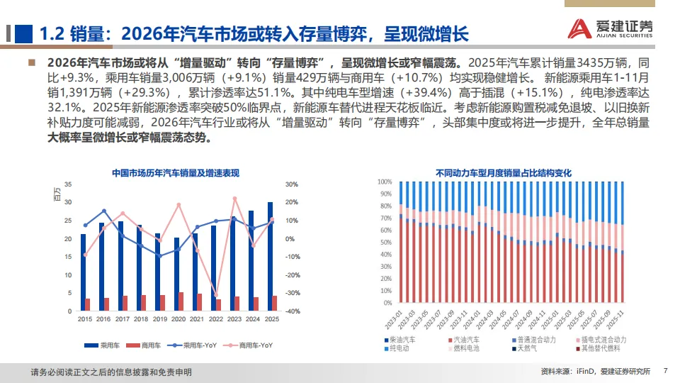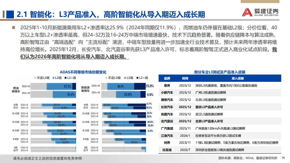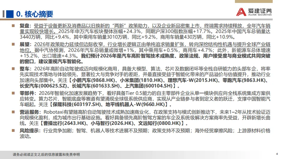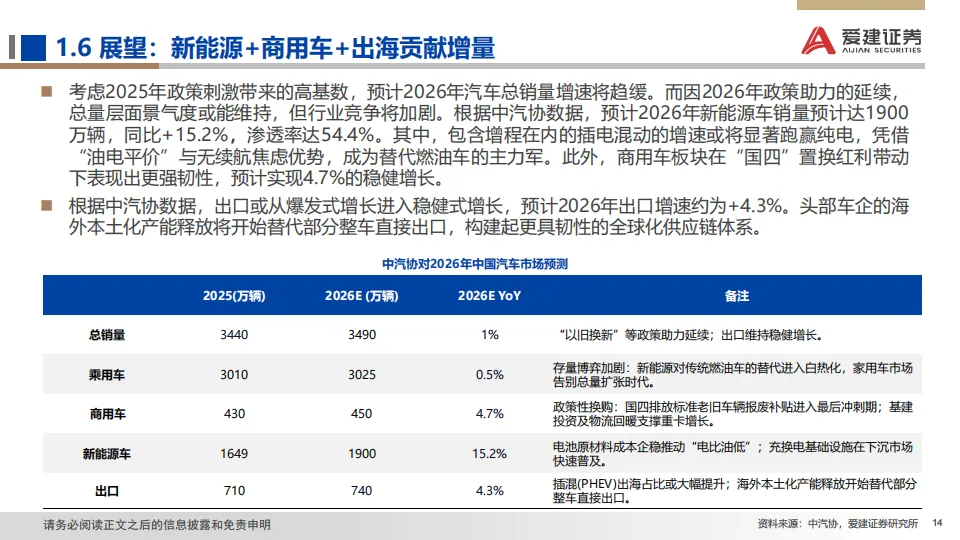 展望:2026年政策助力延续但边际收窄,行业增长逻辑正由单纯追求销量扩张,转向深挖结构性机遇与提升全球产业链地位。据中汽协预测,2026年汽车总销量或微增+1%,其中乘用车+0.5%,商用车+4.7%;此外,新能源车总体增速+15.2%,出口增速+4.3%。我们预计2026年是汽车高阶智驾技术成熟度、政策法规、用户接受度与商业模式共同突破的窗口。