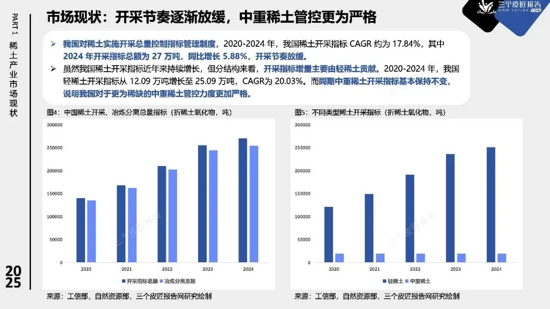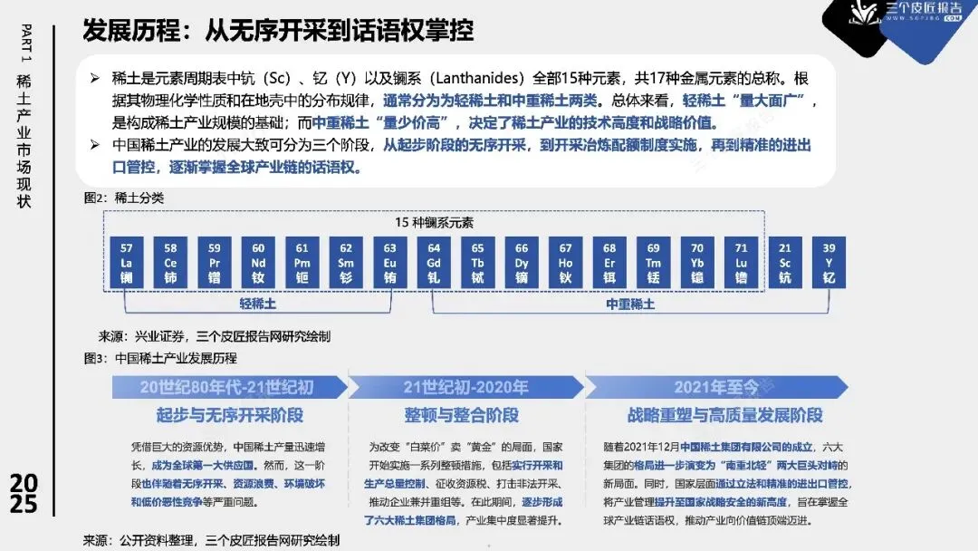 但你可能想不到,中国稀土产业曾经历过"白菜价卖黄金"的尴尬时期。报告把发展历程分为三个阶段:20世纪80年代的无序开采、21世纪初的整顿整合、2021年至今的战略重塑。最关键的转折点是2024年《稀土管理条例》的出台,标志着稀土监管步入刚性时代。