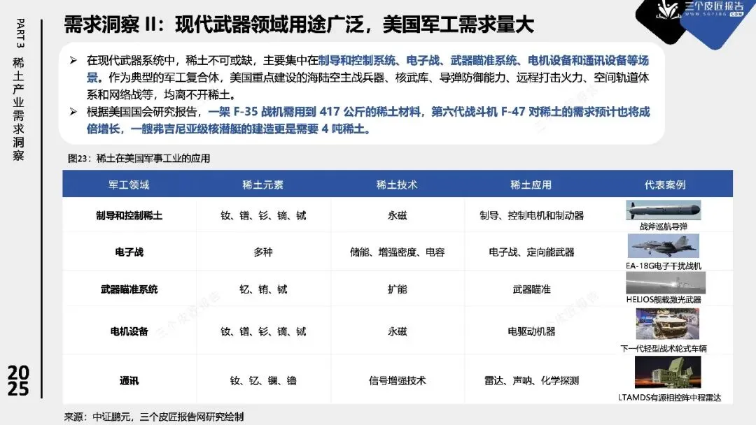 军工领域更是离不开稀土。一架F-35战机需要417公斤稀土材料,一艘核潜艇要4吨。美国77%的稀土进口来自中国,这种依赖度让五角大楼夜不能寐。