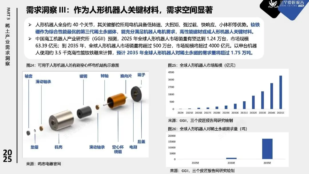 人形机器人是未来黑马。到2035年全球销量将超500万台,单台用量3.5千克,需求总量将达1.75万吨。稀土永磁成为机器人的"心脏材料"。