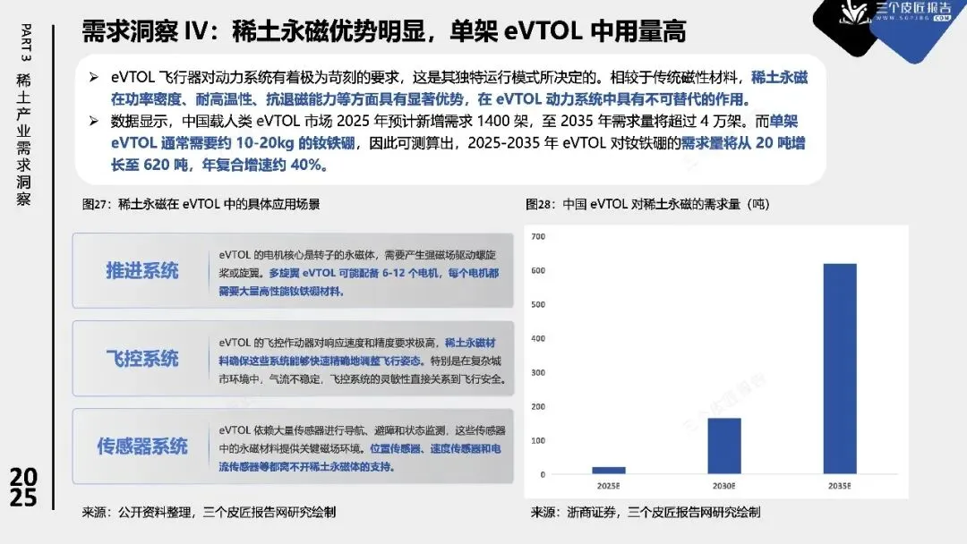 飞行汽车(eVTOL) 单架需要10-20公斤钕铁硼,预计2035年需求量将达620吨,年复合增速40%。这些新兴领域正在重塑稀土需求格局。