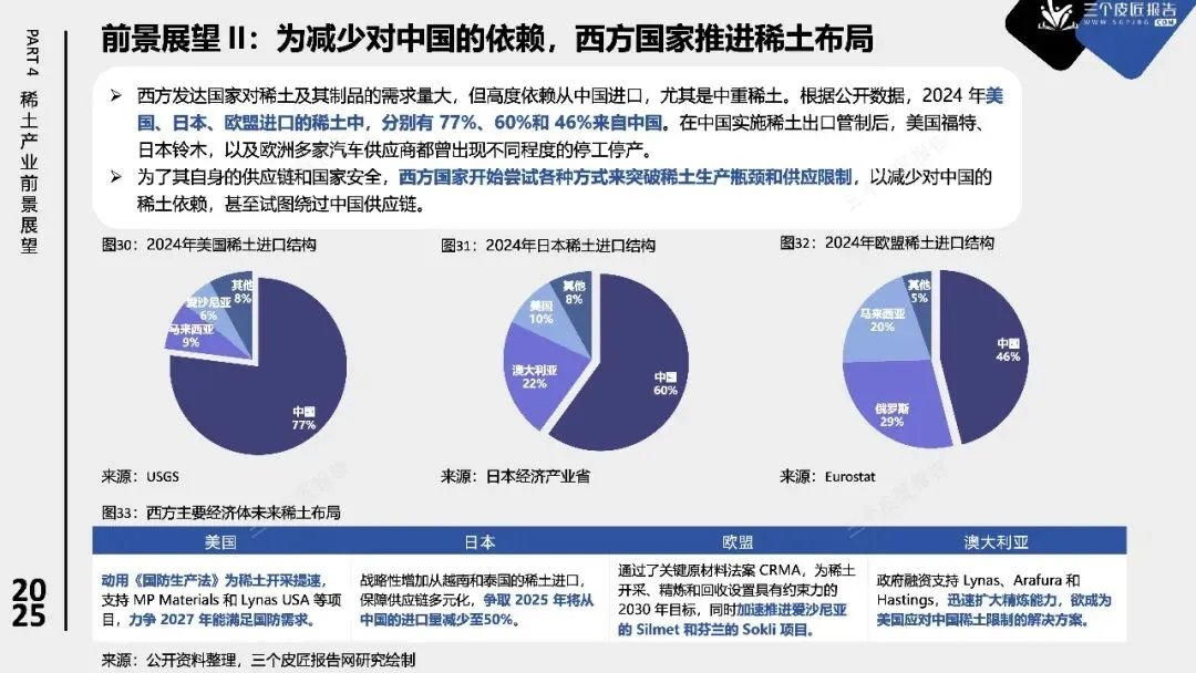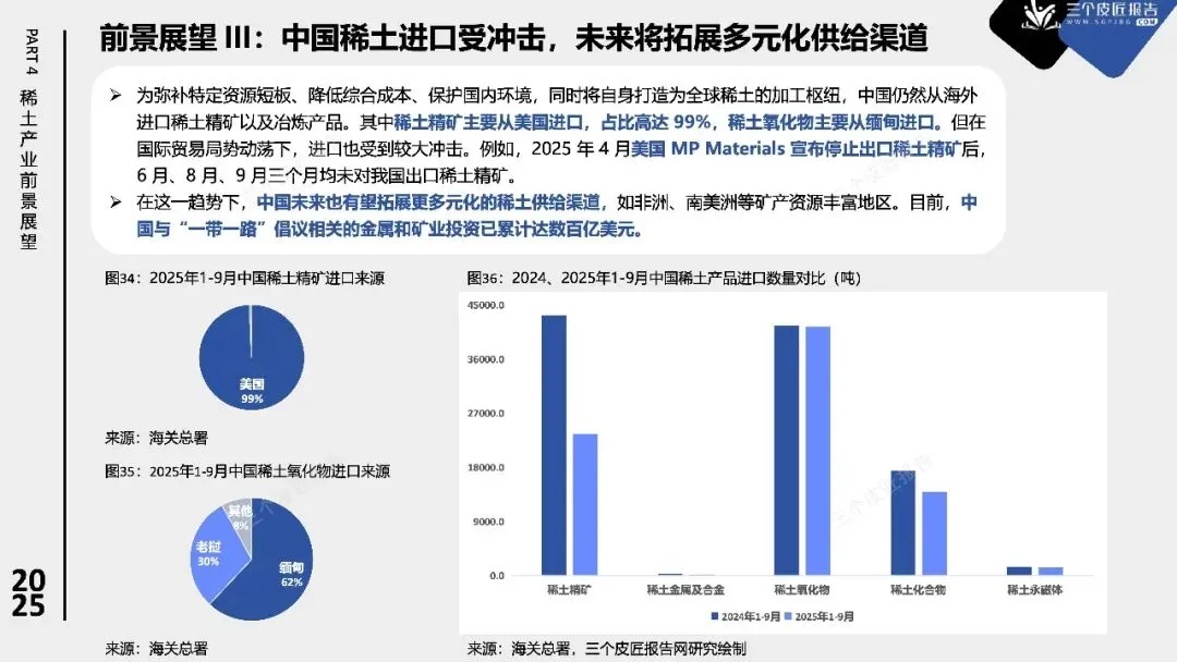 进口渠道正在重塑。中国从美国进口稀土精矿(占比99%),从缅甸进口稀土氧化物。但2025年4月美国企业停止出口后,中国加速开拓非洲、南美洲等新渠道。