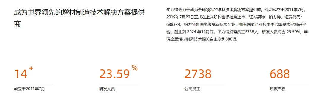 铂力特(股票代码:688333)是一家成立于2011年7月的国家级高新技术企业,并于2019年7月22日在上交所科创板上市,致力于成为全球领先的金属增材制造(3D打印)全套解决方案提供商。公司业务覆盖金属3D打印设备研发与生产、定制化产品服务、专用原材料及工艺技术服务等全产业链,其产品与服务广泛应用于航空航天、工业机械、能源动力、医疗齿科、汽车制造等领域。截至2024年底,公司拥有员工约3000人,研发人员占比约30%,累计申请专利超600项,展现了强大的技术实力和创新能力。作为行业领军企业,铂力特不仅参与国家级重点项目,还积极推动产业智能化与绿色化转型,是金属增材制造领域的重要参与者。
