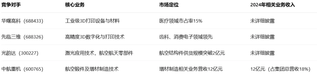 铂力特在国内金属增材制造产业中处于龙头地位,主要竞争对手包括: