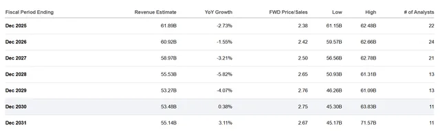 从时间线可以看出,这不会立即对辉瑞造成冲击。预计2026财年将减少约15亿美元,2027财年将翻一番,达到30亿美元以上,2028财年将再次翻番,达到60亿美元以上,因此影响将逐渐平缓。长期营收增长的共识已经将此因素考虑在内,预计到2030年,营收将减少约84.1亿美元(总变化为-13.58%)。