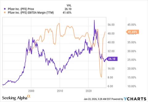 我从2024年初就看好辉瑞(PFE),因此,我最近8次更新的平均结果(如果进行汇总)仅略微为正,且该平均回报率低于标普500指数(SP500)的涨幅。然而,如果您仔细观察上面的价格走势并将其与营收增长轨迹进行对比,就会发现市场具有前瞻性——辉瑞股价在营收停滞之前就已经下跌。基于此逻辑,我认为,即使考虑到研发投入(LOE)的影响,销售额的逐步恢复正常(得益于新药的上市)也将为最终的业绩逆转创造有利条件。而要实现这一目标,我们需要看到辉瑞能够像2026财年第四季度那样,再次超越目前较为悲观的市场预期。我相信即将发布的2027财年第一季度业绩也将表现强劲,同样超出市场预期。如果真是如此,由于估值过低,该股可能会出现积极反应。因此,我认为在财报发布前(定于2026年2月3日发布)没有理由卖出辉瑞股票。