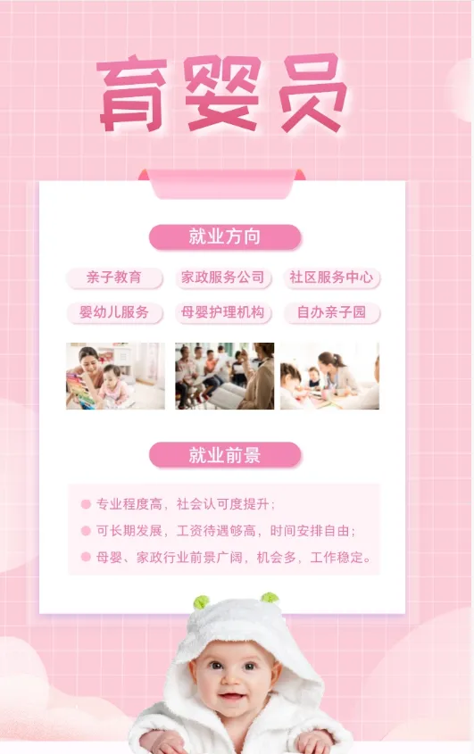 社会的发展,家政行业迅速在市场上占据了不可忽略的地位,婴幼儿早期教育市场的迅猛发展,家长们对幼儿的教育问题也越来越重视,聘请育婴员对孩子进行早期的科学护理和教育,逐渐成为一个热门职业领域。
