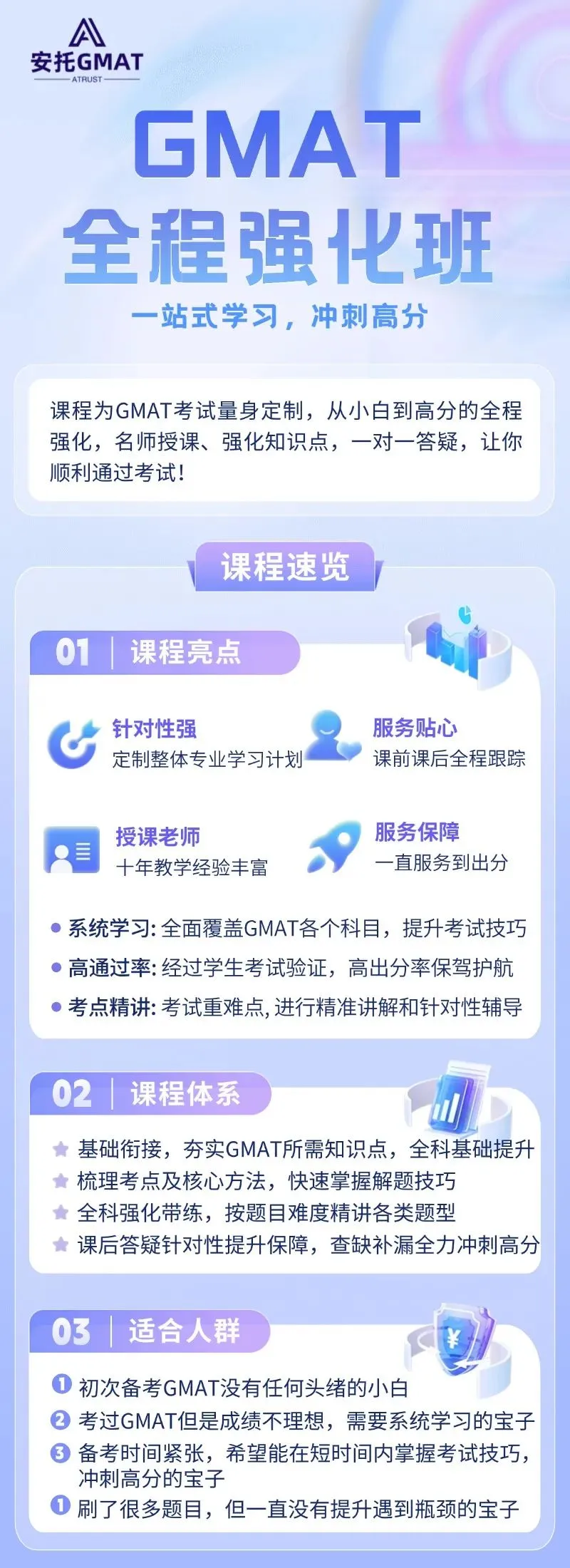 安托GMAT/GRE课程皆可预约,在线提分课/一对一(线上线下)定制课等多种班型皆有,且正式课程均配有1v1学管师(1v1测评+学习计划制定/调整+跟进每日学习打卡等),双重答疑,辅助高效备考。扫码并回复“课程”咨询详情并预约名额~~