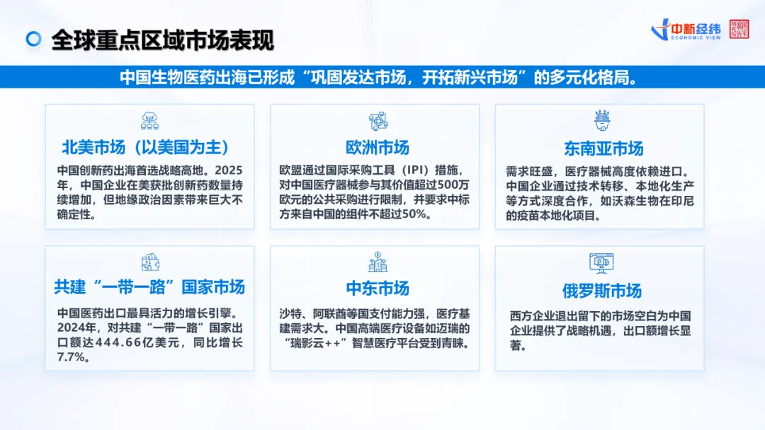 从市场布局看,中国生物医药出海已形成“巩固发达市场、开拓新兴市场”的多元格局:美国仍是创新药首选高地;东南亚、中东、“一带一路”共建国家等新兴市场增长潜力巨大;欧洲则因政策壁垒带来不确定性。