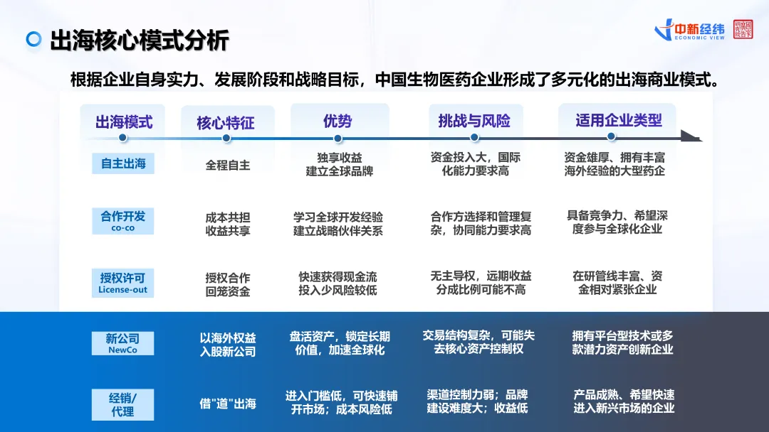 围绕当前最受关注的出海模式,《报告》指出,中国生物医药企业已形成较为多元的路径体系,包括自主出海、合作开发(Co-Co)、授权许可(License-out)、NewCo模式以及经销代理等多种方式,并整体呈现出由“单纯权益交易”向“深度参与全球价值链”的演进趋势。