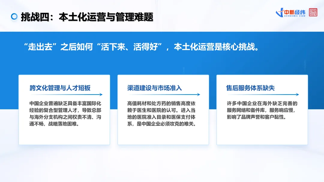 与此同时,《报告》也并未回避现实挑战,系统提出当前医药企业出海仍面临多重风险与约束,包括政策法规与监管壁垒、市场竞争与品牌认知不足、地缘政治与供应链风险,以及本土化运营与管理能力不足等问题。