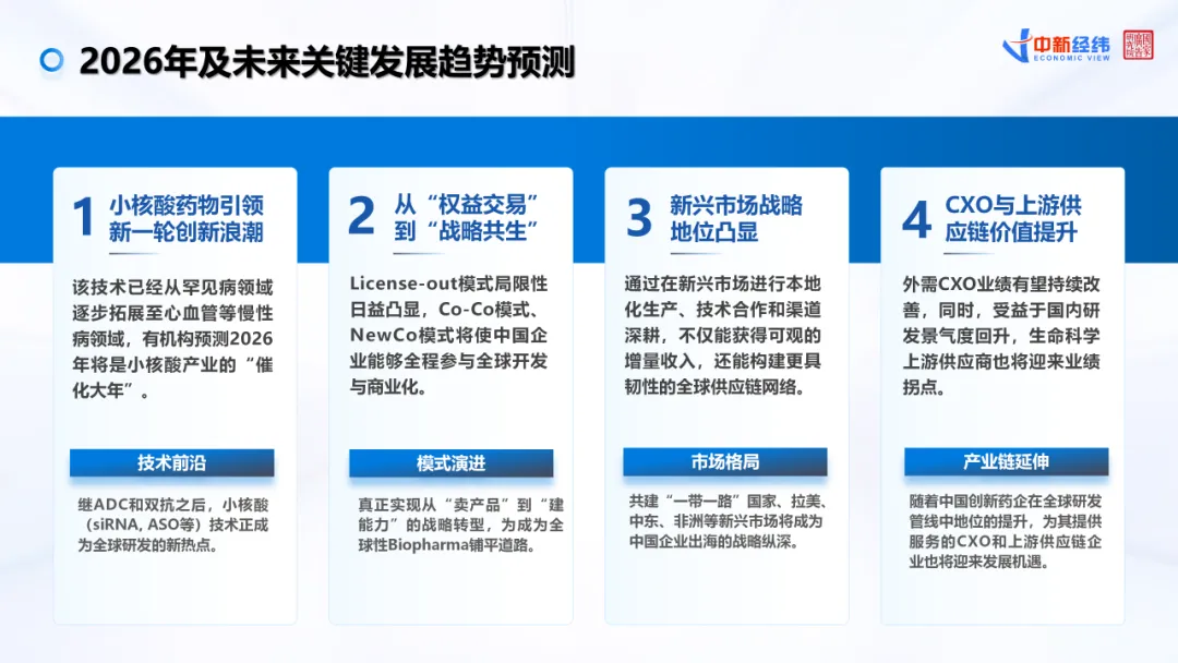 围绕这一判断,《报告》提出了面向2026年及更长周期的四大关键趋势:一是技术前沿持续演进,小核酸(siRNA、ASO等)正在成为全球研发的新热点;二是出海模式由“权益交易”向“战略共生”演进,Co-Co模式与NewCo模式将使中国企业更深度参与全球开发与商业化;三是新兴市场战略地位不断凸显,“一带一路”共建国家、拉美、中东、非洲等区域将成为重要战略纵深;四是产业链协同效应增强,医药外包服务组织(CXO)及上游供应链企业有望随创新药国际化进程同步受益。